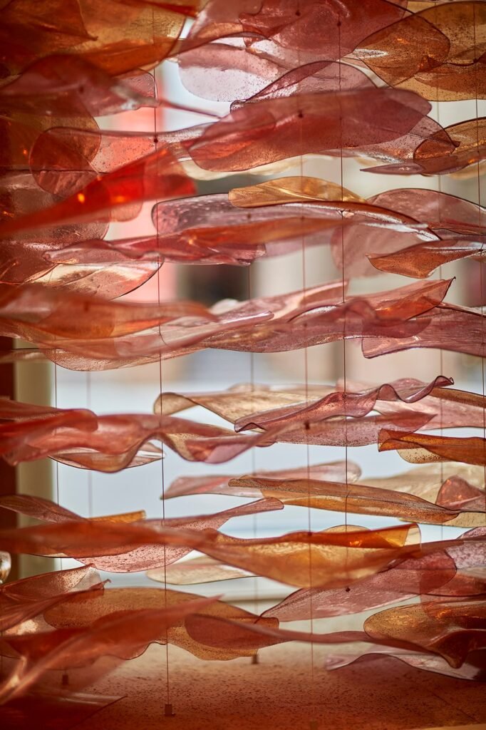 Las piezas, producidas una a una mediante un proceso semiindustrial, reproducían el movimiento fluido de un banco de peces, creando una atmósfera orgánica y dinámica.