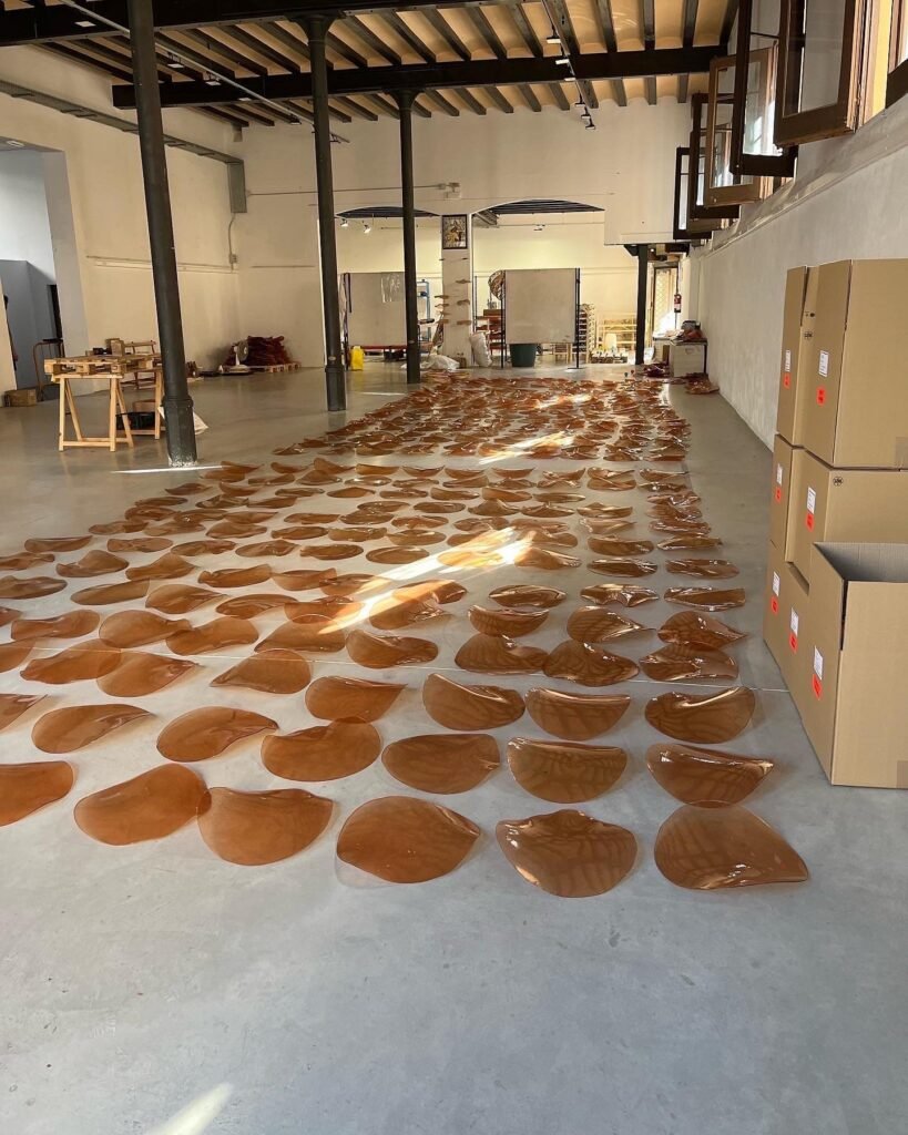Desde Naif Lab desarrollamos un sistema escultórico compuesto por 1.500 discos suspendidos, elaborados con nuestro biomaterial Reolivar Air, creado a partir de huesos de aceituna, biopolímeros naturales y pigmentos vegetales.